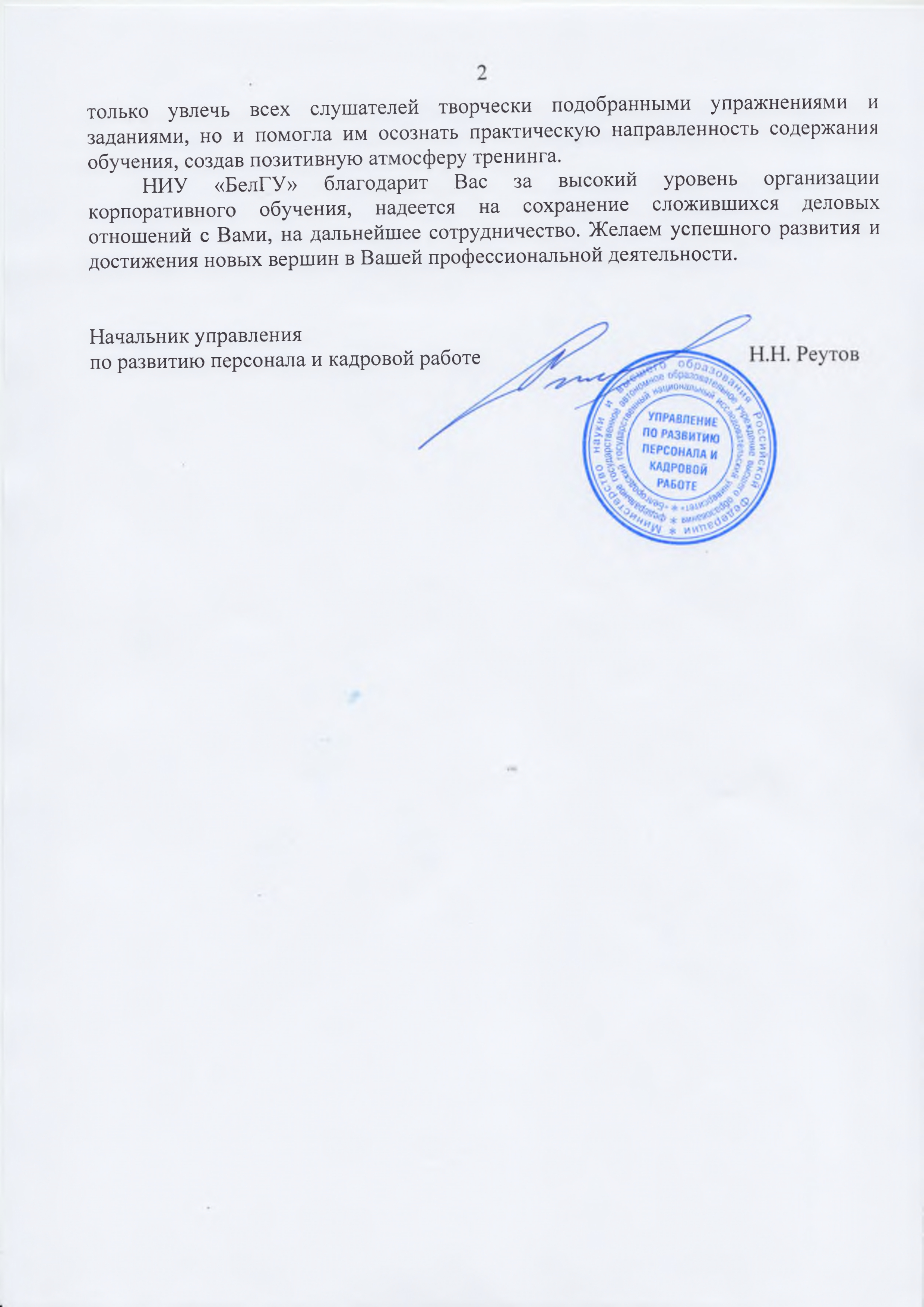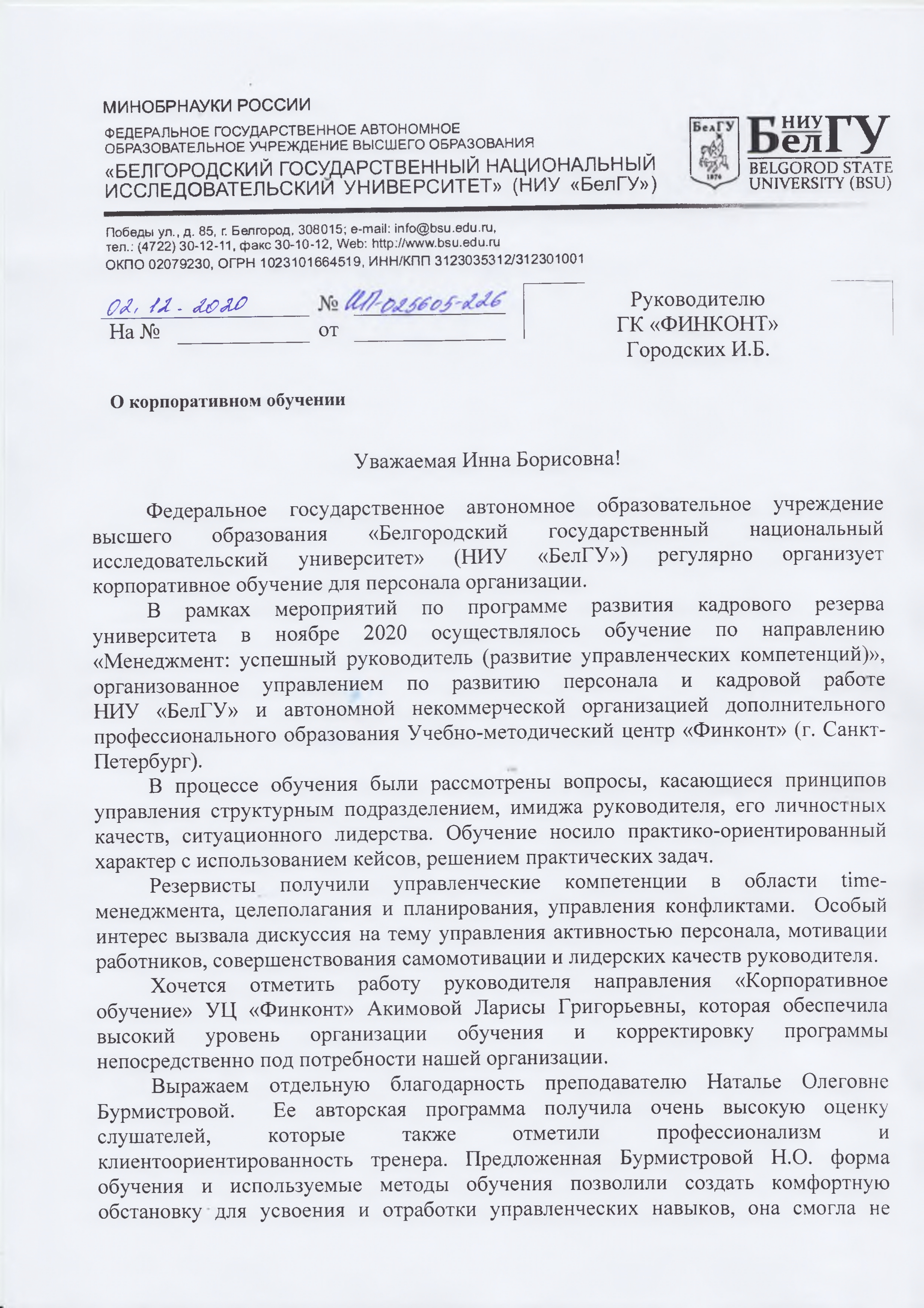 В рамках мероприятий по программе развития кадрового резерва университета в ноябре 2020 осуществлялось обучение по направлению «Менеджмент: успешный руководитель (развитие управленческих компетенций)», организованное управлением по развитию персонала и кадровой работе НИУ «БелГУ» и автономной некоммерческой организацией дополнительного профессионального образования Учебно-методический центр «Финконт» (г. Санкт-Петербург).