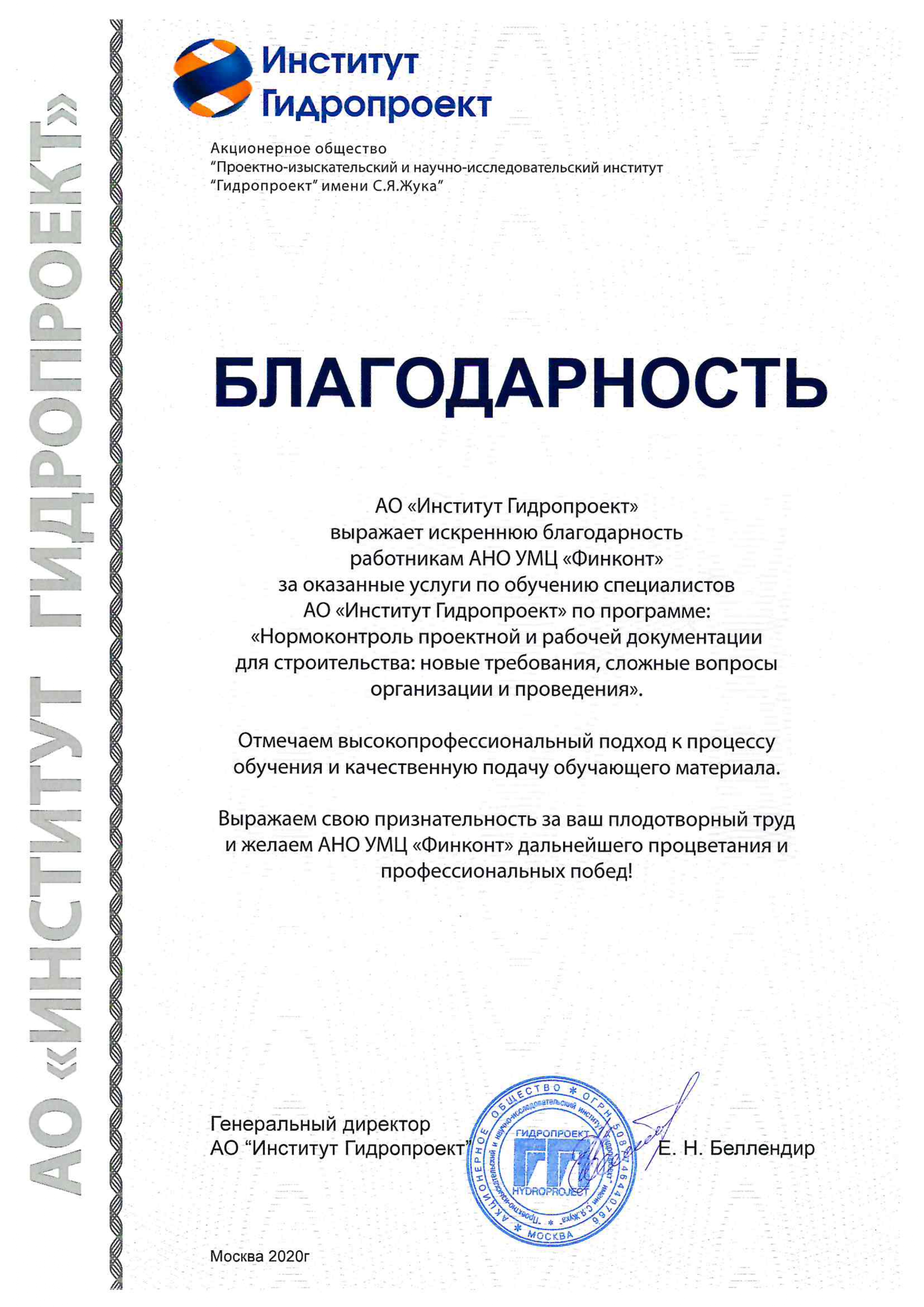 Учебный Центр ФИНКОНТ провел корпоративное обучение для сотрудников АО «Институт Гидропроект».АО «Институт Гидропроект» выражает искреннюю благодарность работникам АНО УМЦ «Финконт» за оказанные услуги по обучению специалистов АО «Институт Гидропроект» по программе: «Нормоконтроль проектной и рабочей документации для строительства: новые требования, сложные вопросы организации и проведения».